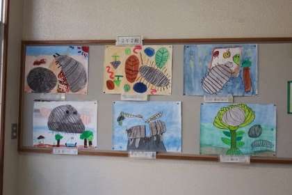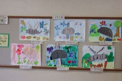 図工で取り組んできた感想画「だんごむし そらをとぶ」が完成しました。学年掲示板に掲示されている作品を紹介します。どの作品もだんごむしがまるで生きているように描けました。写真は、2年1組と2組の作品です。