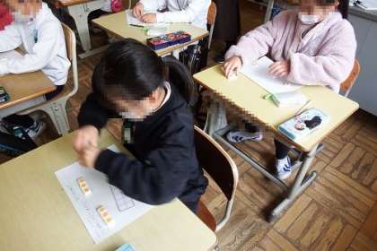 算数「おなじかずずつ」の学習に取り組みました。「クッキー12こを、3人で同じ数ずつに分けます」数図ブロックを上手に使い、「おなじかずずつ」の意味に気づいていきました。この学習が、かけ算やわり算の基礎となっていきます。