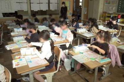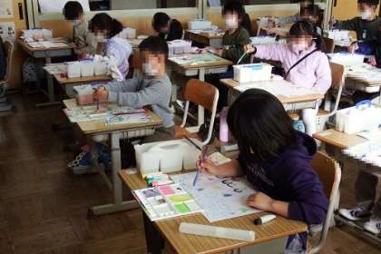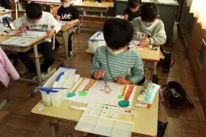 図工の時間に、トヨタの森の体験の様子を絵に描き、絵の具を使って色塗りをしました。一本ばしやジェットコースター、きのこなどを丁寧に塗っていきます。色をまぜて作ることを学習しました。
