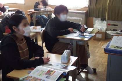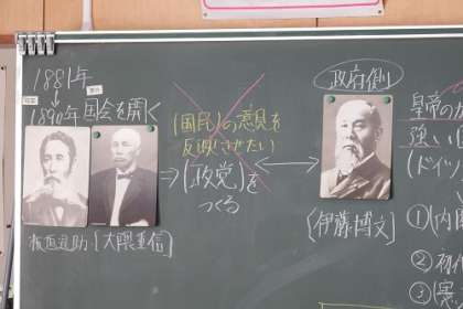 社会科で、明治維新について学習しています。この日は、伊藤博文や板垣退助が活躍していた頃について学びました。大日本帝国憲法が発布された頃の時代背景を考えました。