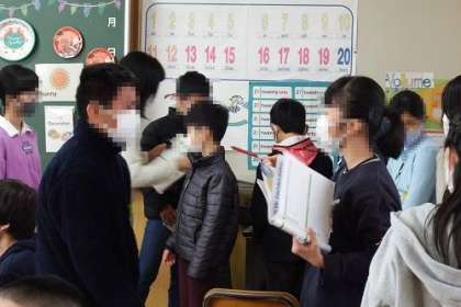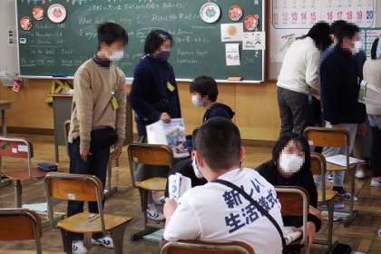 外国語の学習で「小学校の思い出アルバムの内容」を作成しています。小学校で楽しかったことなどを英語でまとめます。友達や先生にアドバイスをもらいながら、作成を進めています。