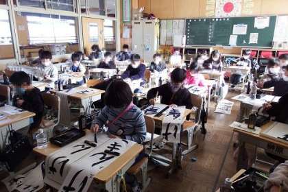 2・3時間目に書初め大会を行いました。各教室では、子どもたちが静かに集中して取り組む姿勢が見られました。緊張感のある時間でした。3年生は毛筆で「げんき」と書きました。写真は、3年3組・4組の様子です。