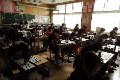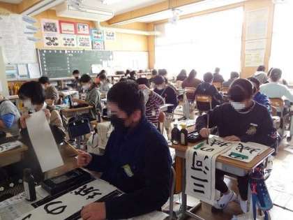 2・3時間目に書初め大会を行いました。各教室では、子どもたちが静かに集中して取り組む姿勢が見られました。緊張感のある時間でした。6年生は毛筆で「三河の城」と書きました。写真は、6年1組・2組の様子です。