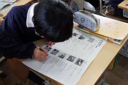 冬休み前に、豊田市郷土資料館の方をお招きし、昔の道具をたくさん紹介していただきました。この日は、「古い道具と昔のくらし体験」をプリントにまとめました。学習したことを思い出したでしょうか。