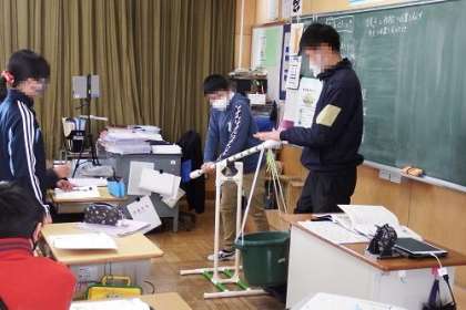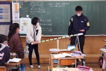 6年生の理科「てこのはたらき」の授業の様子です。今日は、教室に持ち込んだ大きなてこを使って、力点や作用点の位置を変えたときの手ごたえを体を使って実感しました。