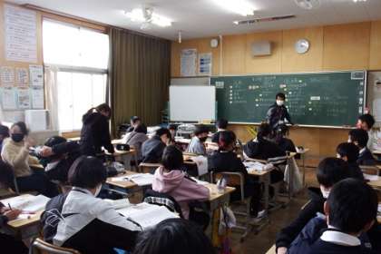 資料「父の仕事」を使って、働くことの意義について考えました。資料に出てくる父は電車の運転士。誇りをもって働く父の姿を見て、父の思いを感じる主人公でした。子どもたちから自分の仕事などとも比較しながら、たくさんの意見が出されました。
