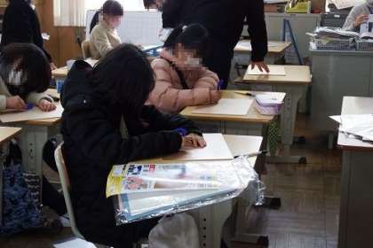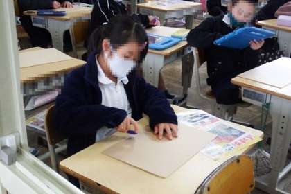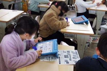 図工「はんをつくろう」の学習で、スチレン版画に取り組んでいます。へらを使って、原版に彫を刻みます。タブレットなどを使いながら、下絵の参考にする子もいます。