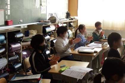 音楽の学習でリズム打ちをみんなで楽しみました。1小節ずつ音符が書き込まれたカードを並べて、みんなでリズム打ちができるか挑戦です。やりとげられた時は、大きな歓声があがっていました。