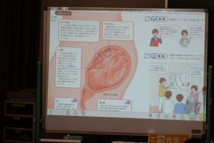 理科「生命のつながり 人のたんじょう」の学習を行っています。今日は、子宮の中で胎児が育っていく様子について学びました。羊水やへそのお、たいばんなどの語句も出てきました。