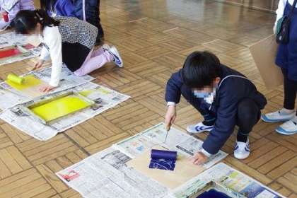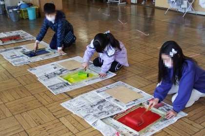 取り組んできたスチレン版画が、完成に近づいてきました。今日は板に色を付け、紙に印刷をしました。子どもたちは、自分の好きな色を選びながら、慎重に色付けしていました。