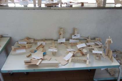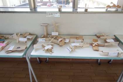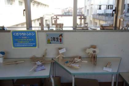 3年生図工で作成した「くぎうちトントン」の作品を、渡りに展示しています。動物や建物など、子どもたちが木を組み合わせて作った楽しい作品がいっぱいです。