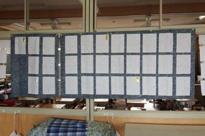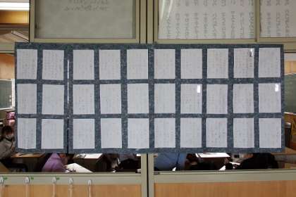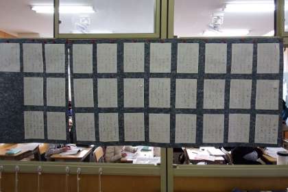 1月に行った2年生の書初めを教室の廊下側に掲示しています。自分が書いた字を見直したり、友だちが書いた字を見合ったりしています。