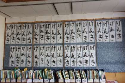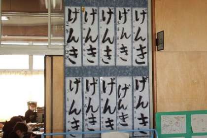 3年生が1月の書初め大会で書いた書初めを展示しています。毛筆で初めて書いた書初めは「げんき」です。廊下や広場に掲示してあります。