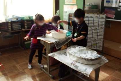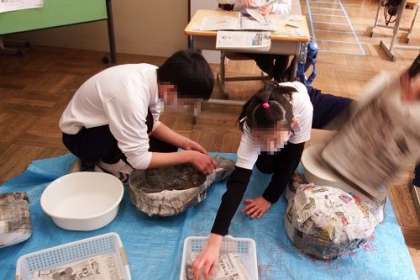 7・8・9・10・11組では、厚紙や新聞紙を使ってのお面づくりに取り組んでいます。中には、自分の体ほどの大きなお面もあります。紙を丁寧に貼り合わせながら、作り上げていきます。