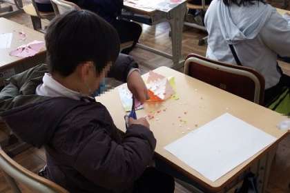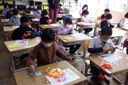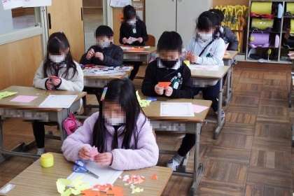 6年生の卒業が近づいてきます。1年生での6年生の卒業をお祝いする掲示物を作成しています。折り紙に切込みをいれながら、きれいな模様を作り出しました。みんなとても楽しそうです。写真は、1年5組の様子です。