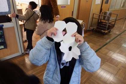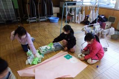 6年生の卒業が近づいてきます。1年生での6年生の卒業をお祝いする掲示物を作成しています。折り紙に切込みをいれながら、きれいな模様を作り出しました。みんなとても楽しそうです。写真は、1年3組の様子です。