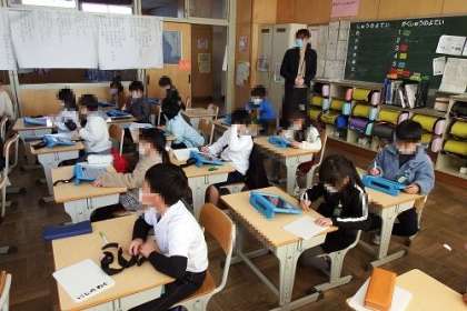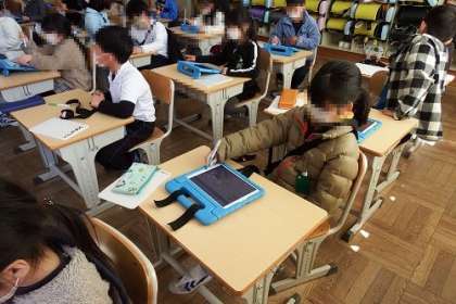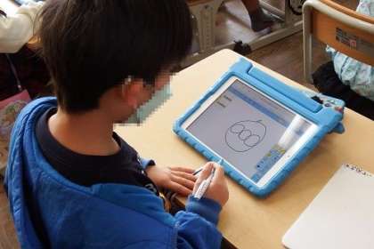 写真は、1年生のタブレット学習の様子です。この日は、グループ機能を使って、お互いの画面を共有することを学びました。自分や友達が描いた絵をその場で見合うことができます。