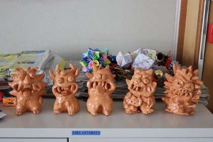 以前図工で作ったシーサーが焼きあがってきました。一体一体個性があって、かわいらしい顔をしています。子どもたちを守ってくれるのかな。