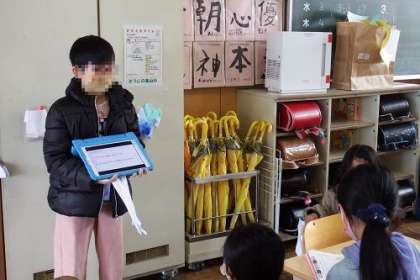 3年生は、国語「外国のことをしょうかいしよう」を配信します。グループで役割分担をしながら、動画を作成しています。みんなの前で発表練習もしました。素敵な発表になりそうです。写真は、3年3組の様子です。