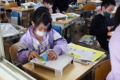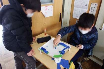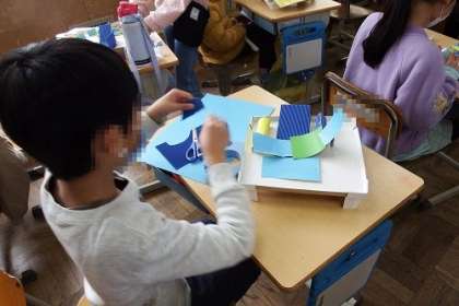 図工「楽しい迷路づくり」で、作品が完成に近づきました。子どもたちは、お互いの迷路を見ながら、実際に磁石を動かして楽しんでいます。