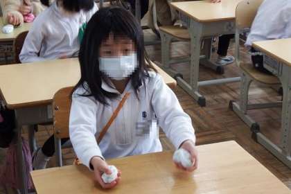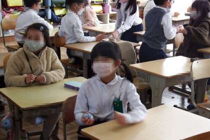 1年生の「昔遊び」の学習で、これまでいろんな遊びに挑戦してきました。この日は、お手玉です。右手の左手を上手に動かしてキャッチします。お手玉を上げる高さにも工夫!