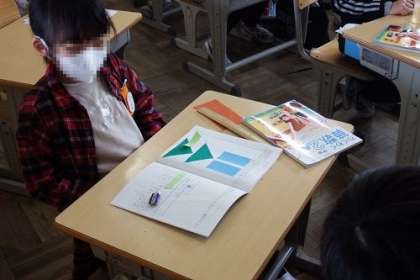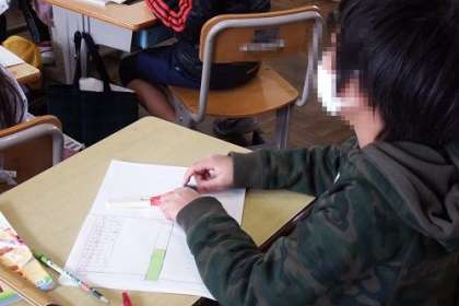 算数の学習で、分数に取り組みました。実際にテープを半分に切り、2分の1を確かめました。これから3分の1や4分の1の学習を進めます。