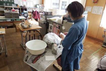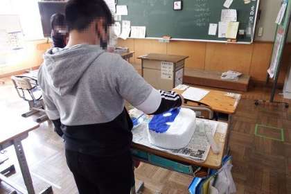 生活単元でお面作りを進めています。新聞紙の上に字が見えなくなるまで白紙を糊付けして重ねていきます。大変な作業ですが、子どもたちは地道に取り組んでいます。中には色付けも始まっています。