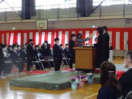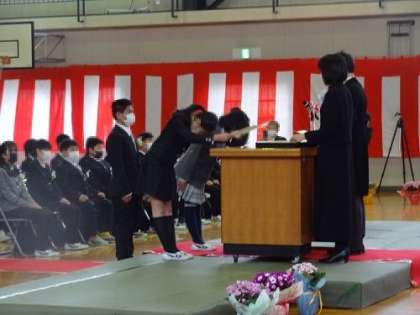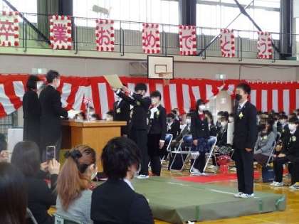 3月18日、令和3年度の卒業証書授与式を挙行しました。卒業生132名が胸をはって旅立っていきます。写真は、卒業証書授与の様子です。