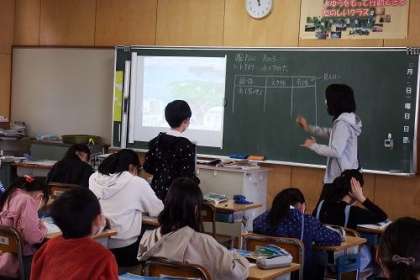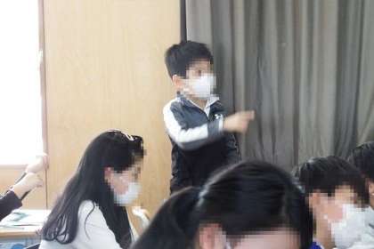 理科「すがたを変える水」の学習のまとめを行いました。固体→液体→気体と変化していく水。実際にはどのように存在しているのか、絵を使って読み取りました。