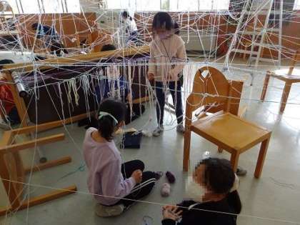 図工の発展学習で、ランチルームを使って、アートを作成。ひもやロープ、机、イスなどを使い楽しくて不思議な空間を思いっきり作り上げました。