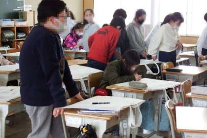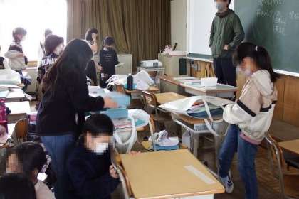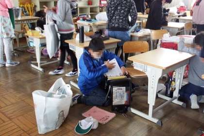 作った作品バックに、一年間の作品をつめこんで。机やロッカーの中まできれいにします。家で作品を眺めながら、一年間を思い出せるかな。