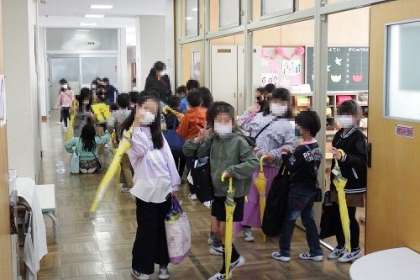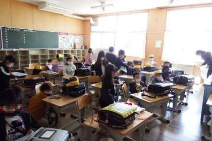 最後の一日。各学級では、お楽しみ会を行ったり、教室をきれいにして荷物を移動したり、通知表をもらったり。一年間過ごした教室、一緒に学んだ友達ともお別れです。写真は、1年生の様子です。