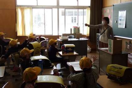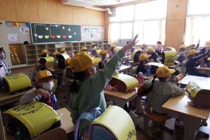 小学校が始まって3日目の1年生。新しい教室や新しい友達にも徐々に慣れてきています。写真は、担任の先生とじゃんけんゲームをしてる様子。みんなのりのりです。こうして関係を深めていきます。