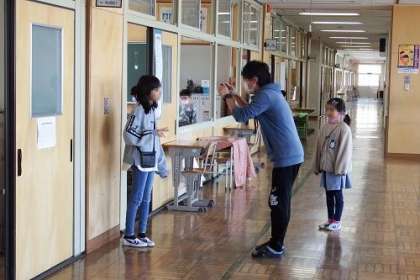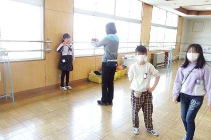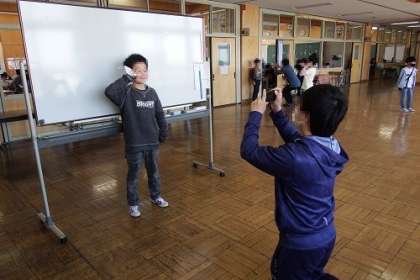 写真は、4年生の個人写真の撮影の様子です。一人一人ポーズをとりながら、写真におさまります。自己紹介や係活動の掲示に使われます。