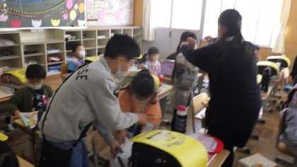 6年生が毎朝1年生の教室に来て、1年生の朝の準備のお手伝いをしてくれています。さすがは6年生。優しいお兄さんお姉さんありがとう。