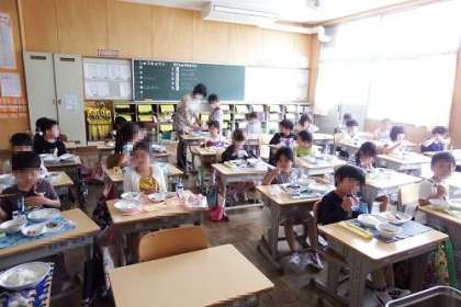 小学校に入っての初めての給食。マスクをとって食べるので、お話はなしです。それでも、元気ににこやかに給食を食べていました。写真は、1年4組、5組の様子です。
