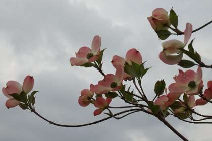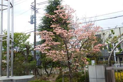 正門横のハナミズキの花が、きれいに咲いています。うす桃色の花びらをいっぱいに開いています。