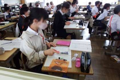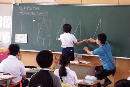 算数「対称な図形」の学習を行いました。この日は、対称な図形を実際に書いてみます。ポイントは対象の軸や点を決めること。友達の意見を聞きながら、ポイントを見つけていきました。
