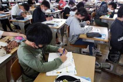 算数で「対称な図形」の学習が進んでいます。この日は、線対称の図形をかくことが課題でした。対象の軸となる線に対してどのように描いたらよいのか、みんなで話し合いました。