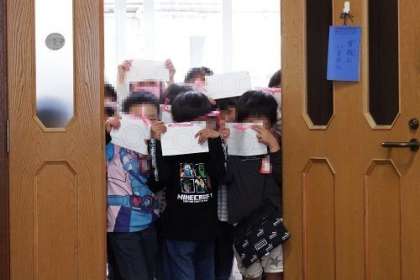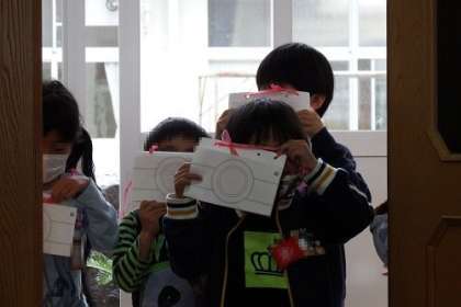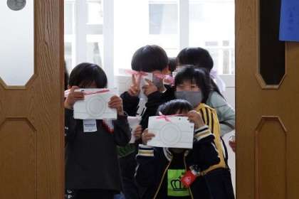 1年生が「学校めぐり」をしています。1年生にとっては、初めてのところばかり。迷子にならないように、校内の道(廊下)や校庭を確認しています。写真は、画用紙で作ったカメラを向けているところです。とてもかわいいです。