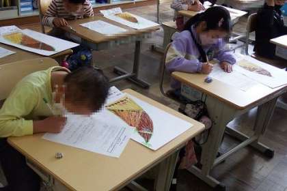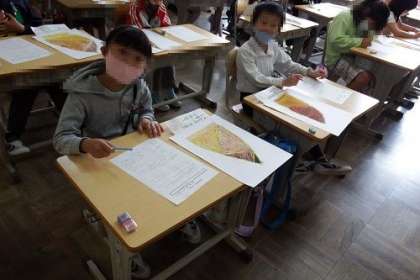 図工で取り組んだ「おはなみ スケッチ」。たけのこの絵を鑑賞しました。同じたけのこでも、子どもたちの描いた絵は、一人一人違います。描く時のポイントを学びました。