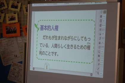 社会科で日本国憲法についての学習を進めています。この日は、日本国憲法の三つの原則の一つである基本的人権について学びました。すべての国民に保障されている基本的人権について今後深めていきます。