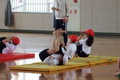 体育の授業で、前転に取り組みました。体の丸め方や手の付き方などポイントを意識しながら、忍者のポーズを入れました。次は、後転です。どんぐりのポーズで挑戦です。