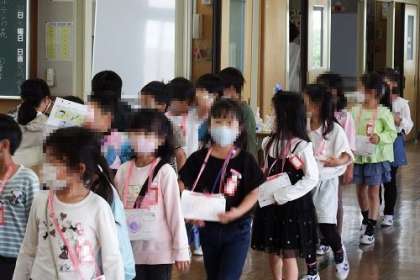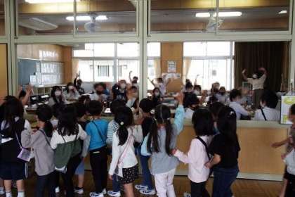 生活科「がっこうとなかよし」で、校内を巡っています。この日は、丁度6年生の教室の前へ。かわいい1年生の子どもたちに目をとめた6年生が、みんなで手をふってくれました。