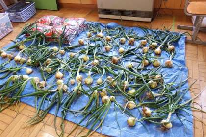 学級園で育ててきた玉ねぎを収穫しました。たくさん収穫でき、現在広場で干しています。子どもたちが家に持ち帰ります。おいしい料理を作ってください。