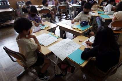 社会科「わたしのまち みんなのまち」で学校を見学する準備が進んでいます。地図を手に、順路を記入して確認しました。普段から見慣れている学区にも、たくさんの不思議があります。
