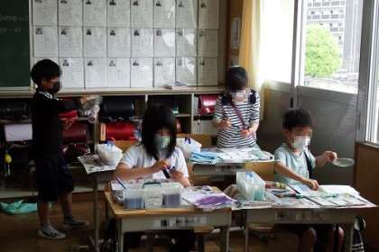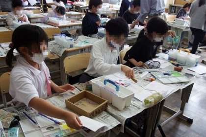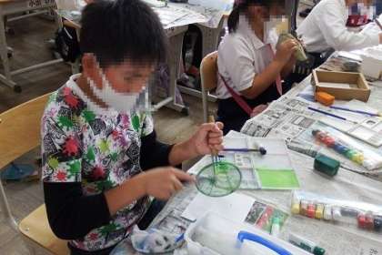 図工の学習で「絵の具と道具の技」を試しました。歯ブラシやあみを使ったスパッタリング、ローラーを使ったローラー、スポンジを使ったスタンピング、箱ビー玉を使ったビー玉アートなど、道具によって表現される新しい世界を楽しんでいるようでした。