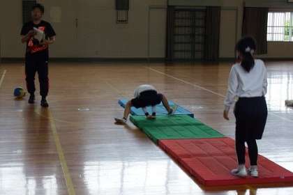 体育の時間に開脚前転に挑戦しました。体の動かし方や手を使い方のポイントを確認しながらのチャレンジです。さっと起き上がれるとみんなとても嬉しそうでした。