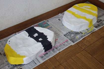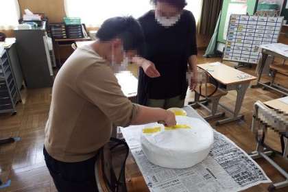 生活単元学習でお面づくりに取り組んでいます。紙を貼り付けお面の形が整ってきました。この日は色付けを始めました。自分の思った色を丁寧に塗っていきます。紙と紙を貼り付けたところは凸凹もあり塗るのが難しいです。