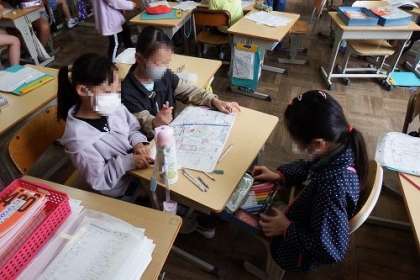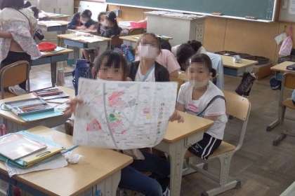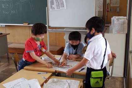 社会科「わたしのまち みんなのまち」で、学区を見学に行きました。見てきたことを地図に表しました。グループで話し合いながら、作り上げました。